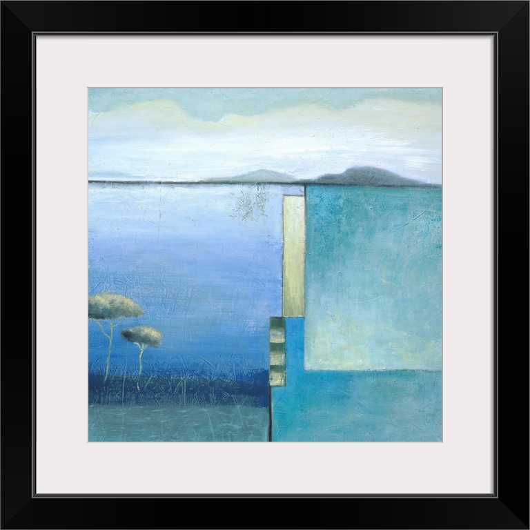 <p>A square modern painting of a lake and mountain landscape with a square design on the right side.</p>