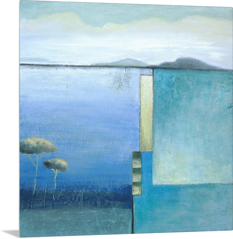 <p>A square modern painting of a lake and mountain landscape with a square design on the right side.</p>