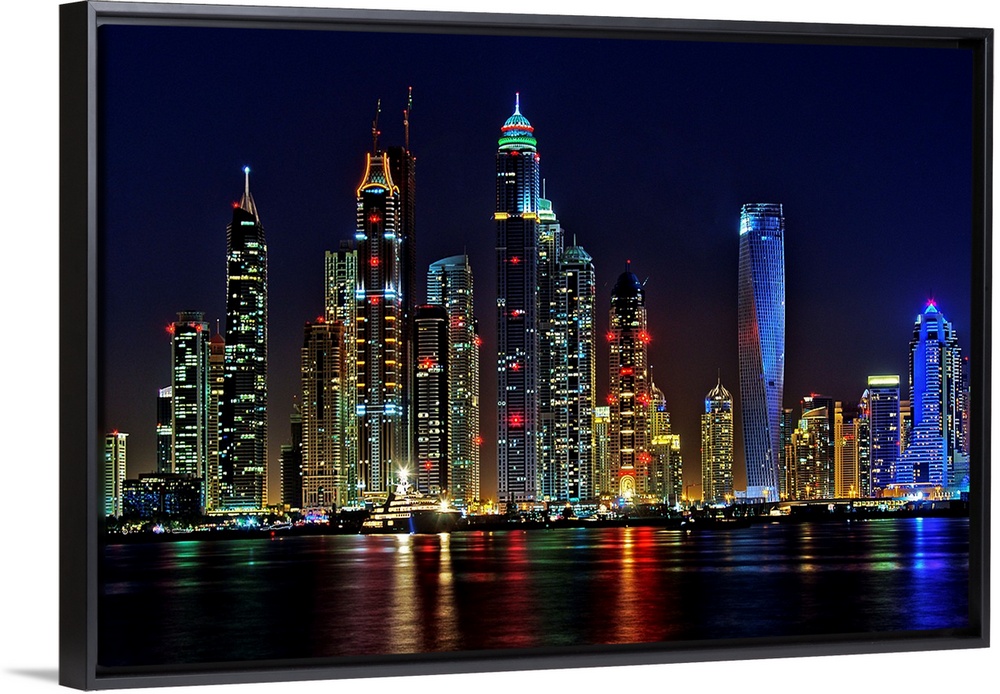 <p>Dubai skyline at night lit up in neon lights.</p>