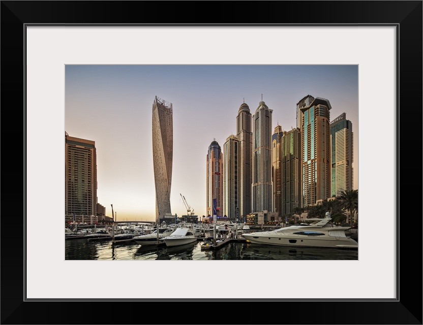 <p>Dubai Marina at sunset with the Cayan Tower (Infinity Tower), the Dubai Marriott Harbour Hotel and Suites and various residential towers, Dubai Marina, Dubai, The United Arab Emirates.</p>