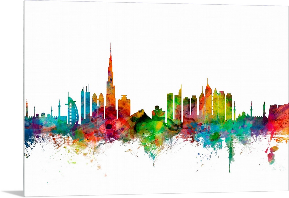 <p>Watercolor artwork of the Dubai skyline against a white background.</p>