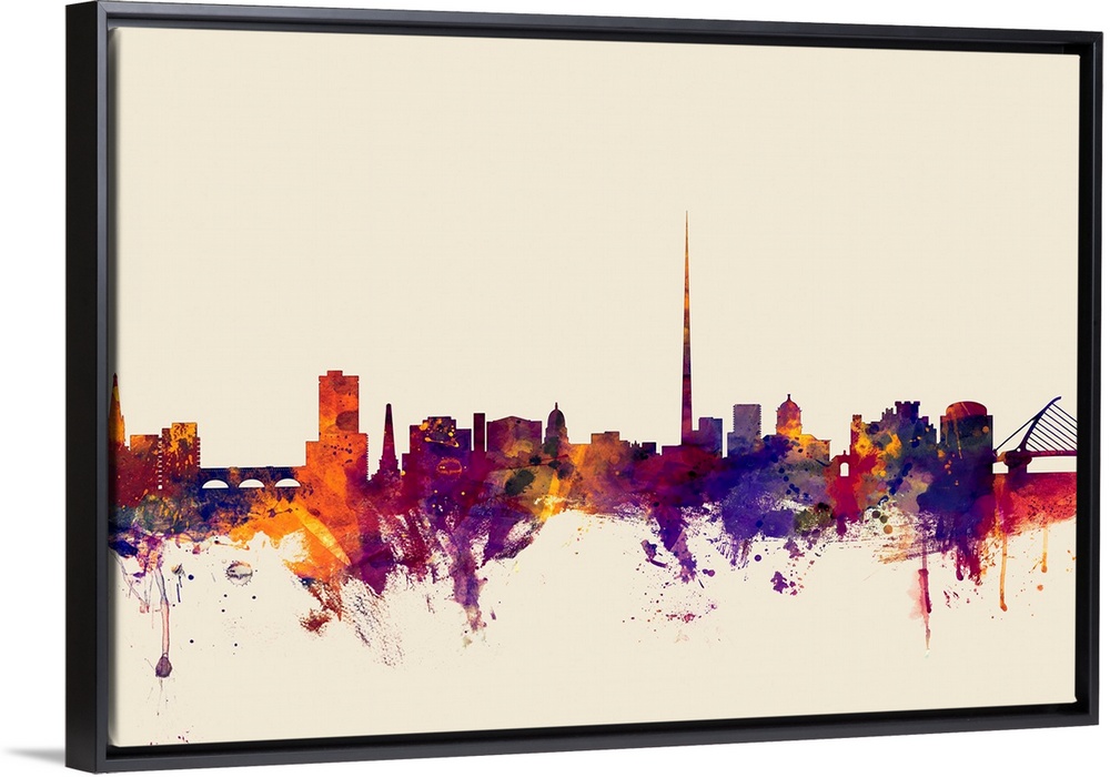 <p>Contemporary artwork of the Dublin city skyline in watercolor paint splashes.</p>