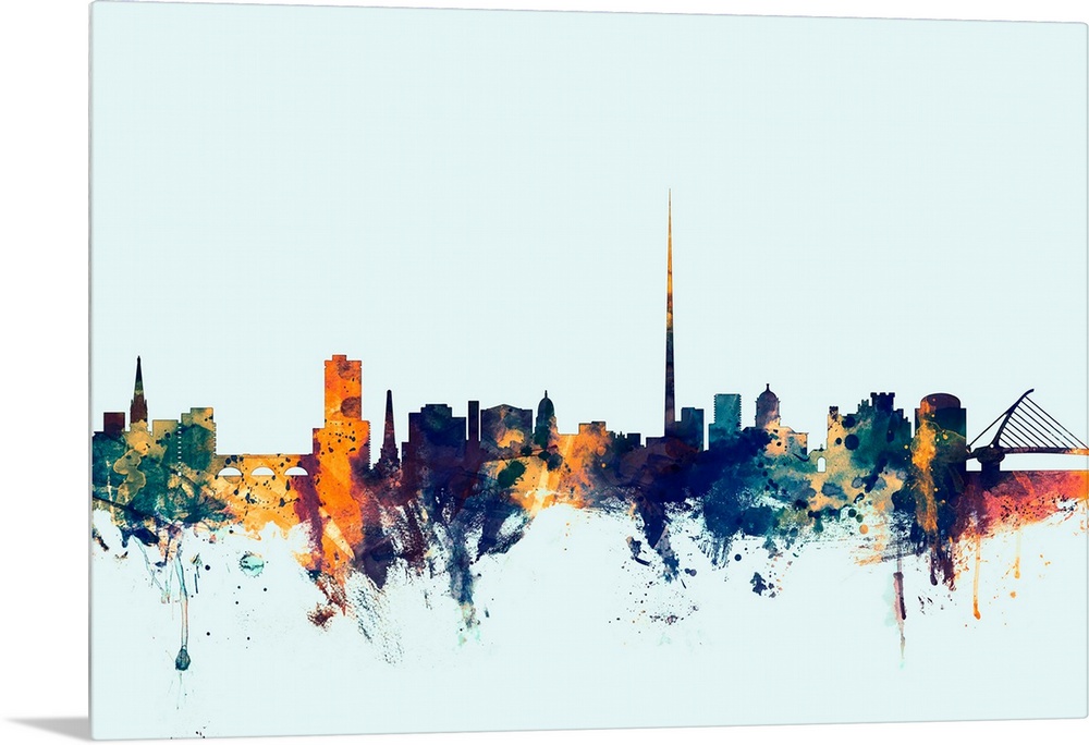 <p>Dark watercolor silhouette of the Dublin city skyline against a light blue background.</p>