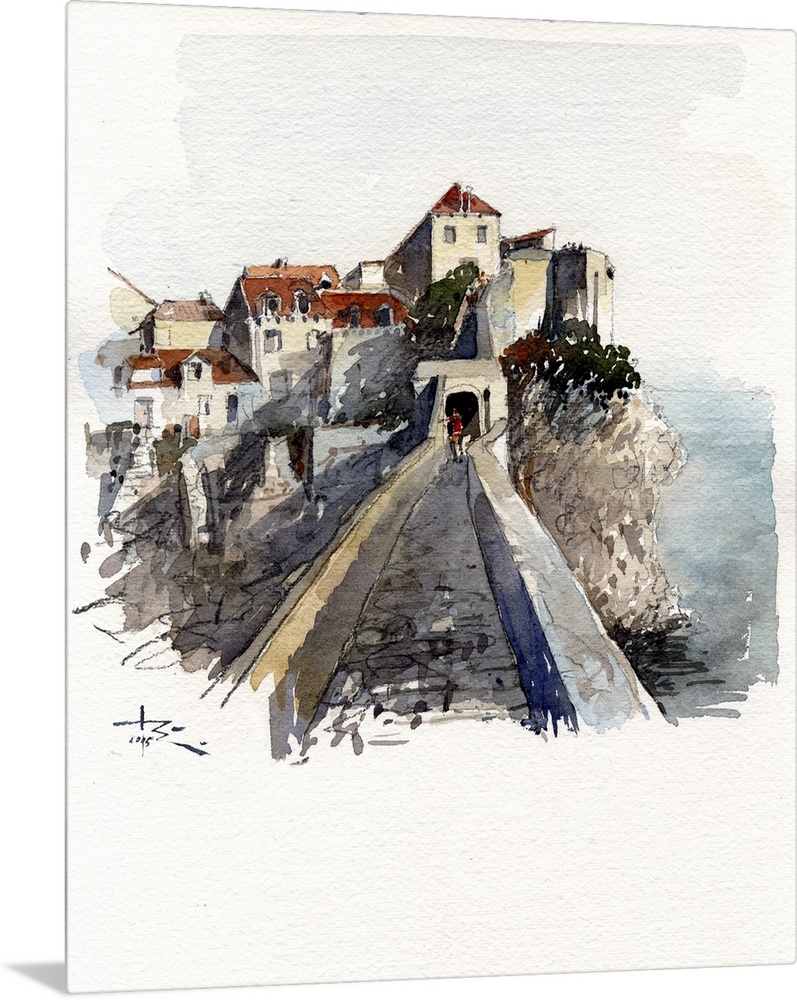 <p>Gestural brush strokes of warm watercolors create a midday landscape of the Dubrovnik Walls.</p>