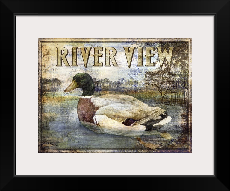 <p>Textured sign with a mallard duck drake in a river with the text River View.</p>