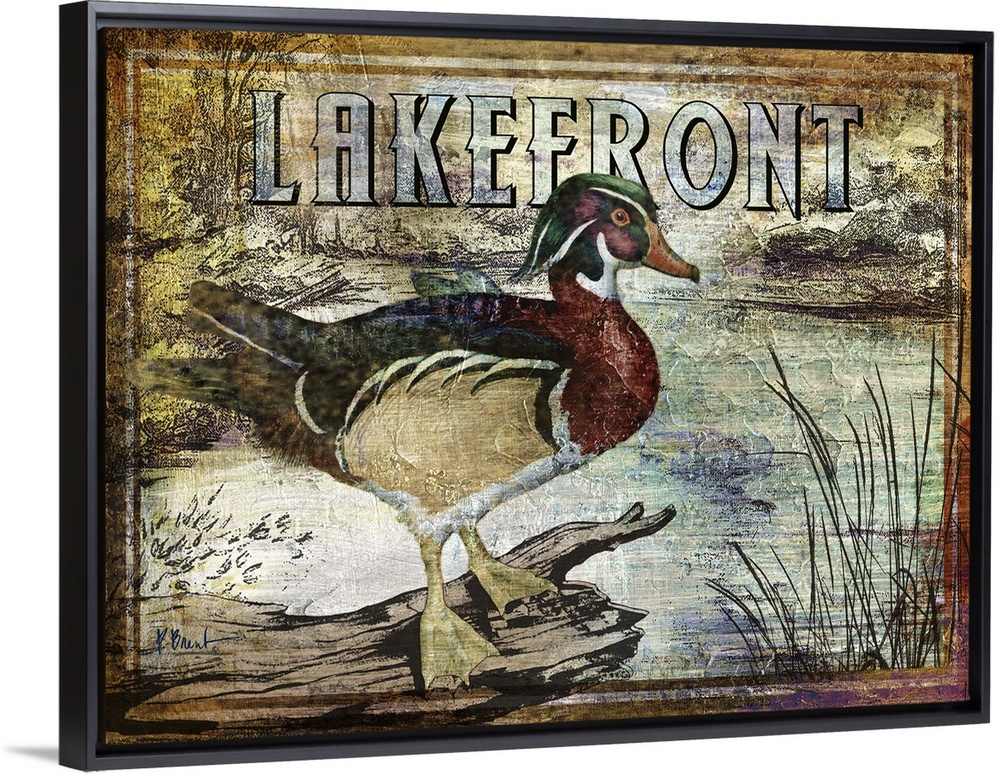 <p>Textured sign with a wood duck drake in a river with the text Lakefront.</p>
