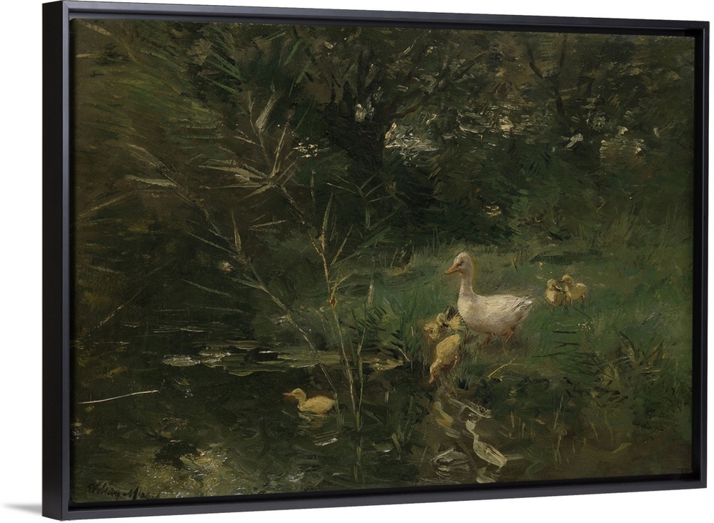 <p>Ducklings, by Willem Maris, c. 1880-1907, Dutch painting, oil on panel. A white duck with her ??ducklings in a waterfront landscape.</p>