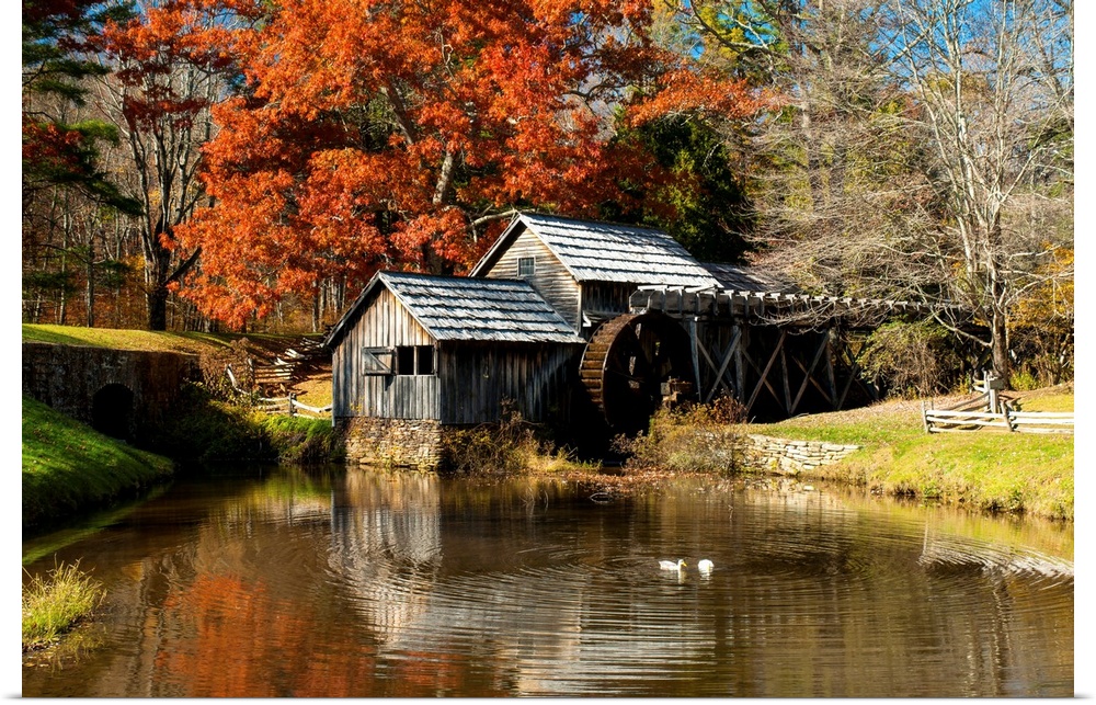 <p>Ducks swimming in a pond at an old grist mill in an autumn landscape.</p>