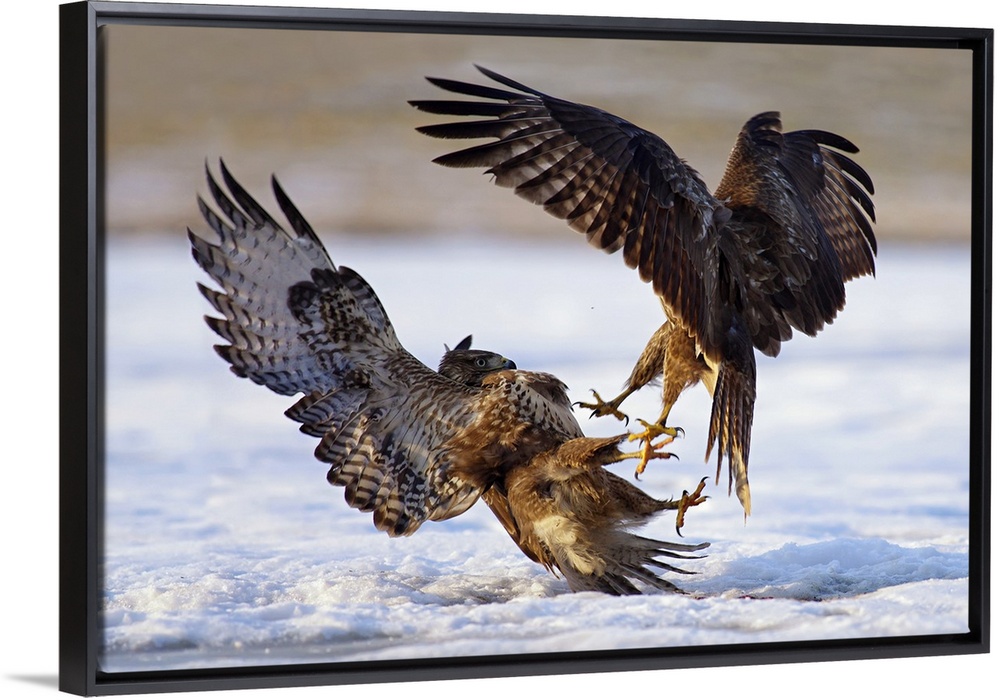 <p>An intense photograph of two aggressive birds of prey fighting each other while flying.</p>