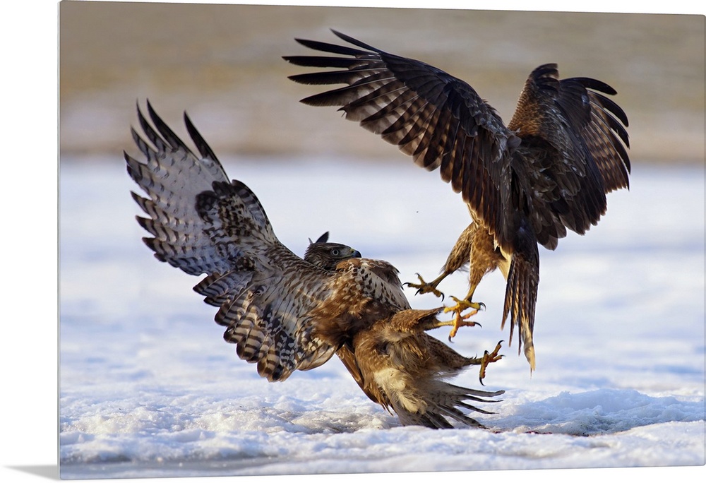 <p>An intense photograph of two aggressive birds of prey fighting each other while flying.</p>