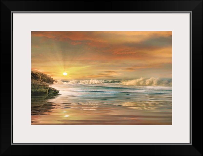 <p>Beautiful photograph of a warm sunset over crashing ocean waves and rocky cliffs.</p>