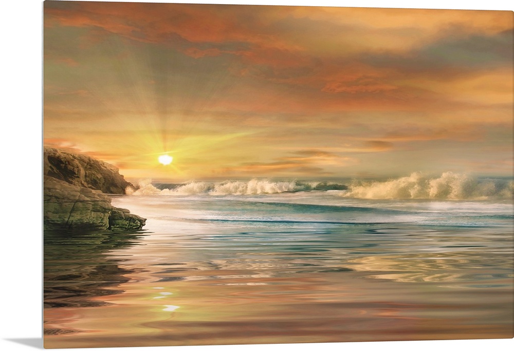 <p>Beautiful photograph of a warm sunset over crashing ocean waves and rocky cliffs.</p>