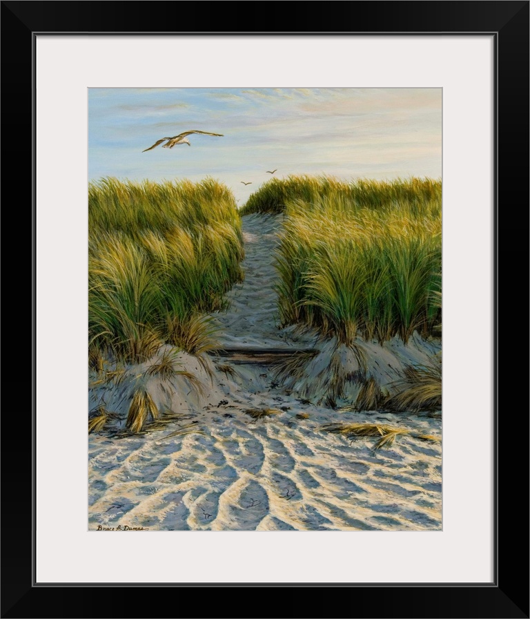 <p>Contemporary artwork of a seagull flying over a path through grassy sand dunes.</p>