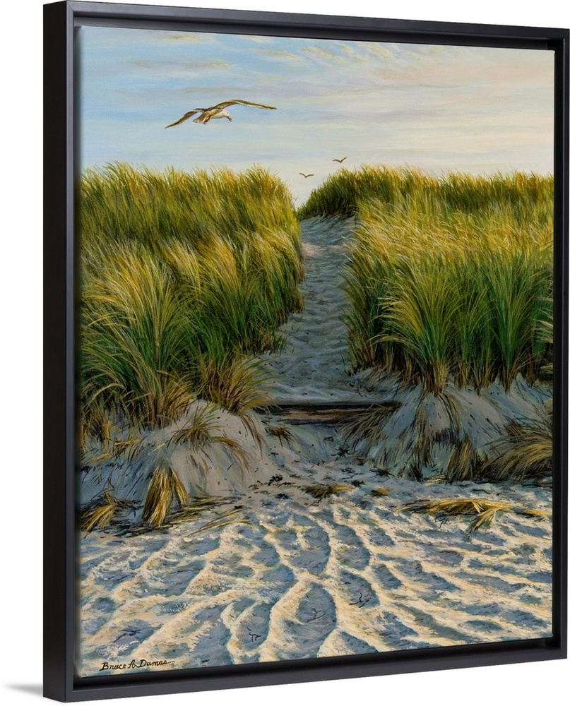 <p>Contemporary artwork of a seagull flying over a path through grassy sand dunes.</p>