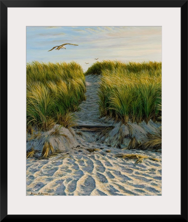 <p>Contemporary artwork of a seagull flying over a path through grassy sand dunes.</p>