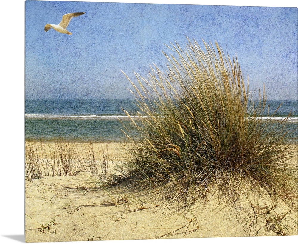 <p>A seagull flying above a beach</p>