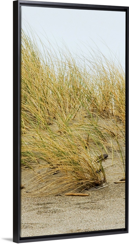 <p>A photograph of a sand dune with tall golden yellow and green beach grass.</p>