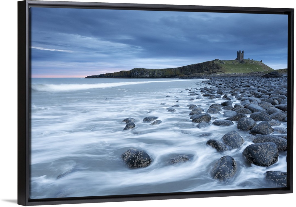 <p>The ruins of Dunstanburgh Castle overlooking the boulder strewn shores of Embleton Bay, Northumberland, England. Spring (April)</p>