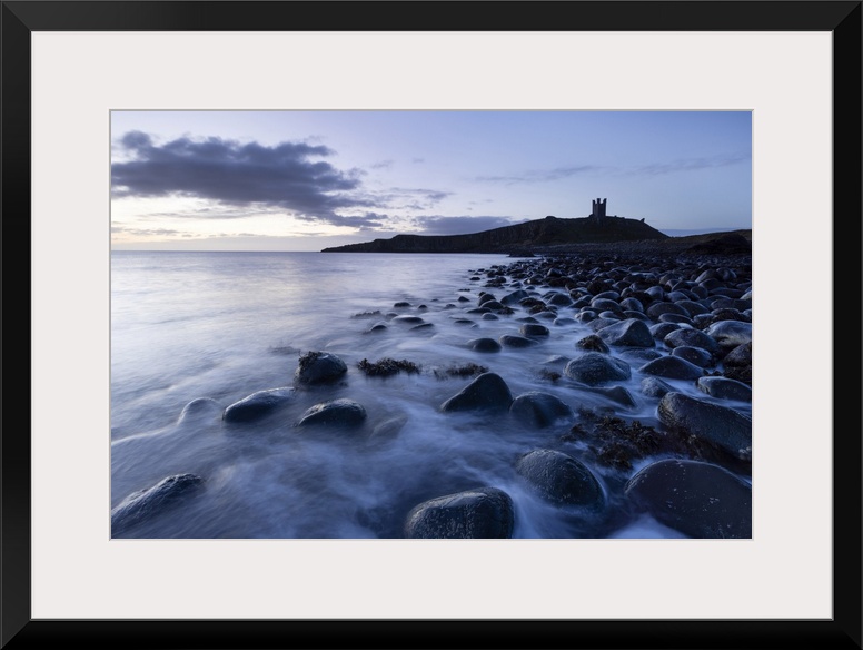 <p>Dunstanburgh Castle ruins and beach of basalt boulders near Embleton, Northumberland, England.</p>