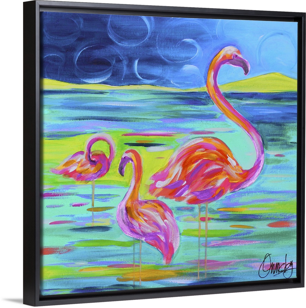<p>Contemporary painting of a flamingo family standing in water.</p>
