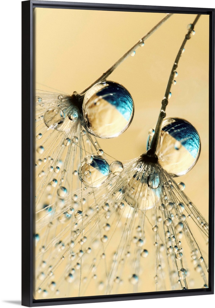 <p>Detail of 2 tiny individual Dandelion seeds with water drops.</p>