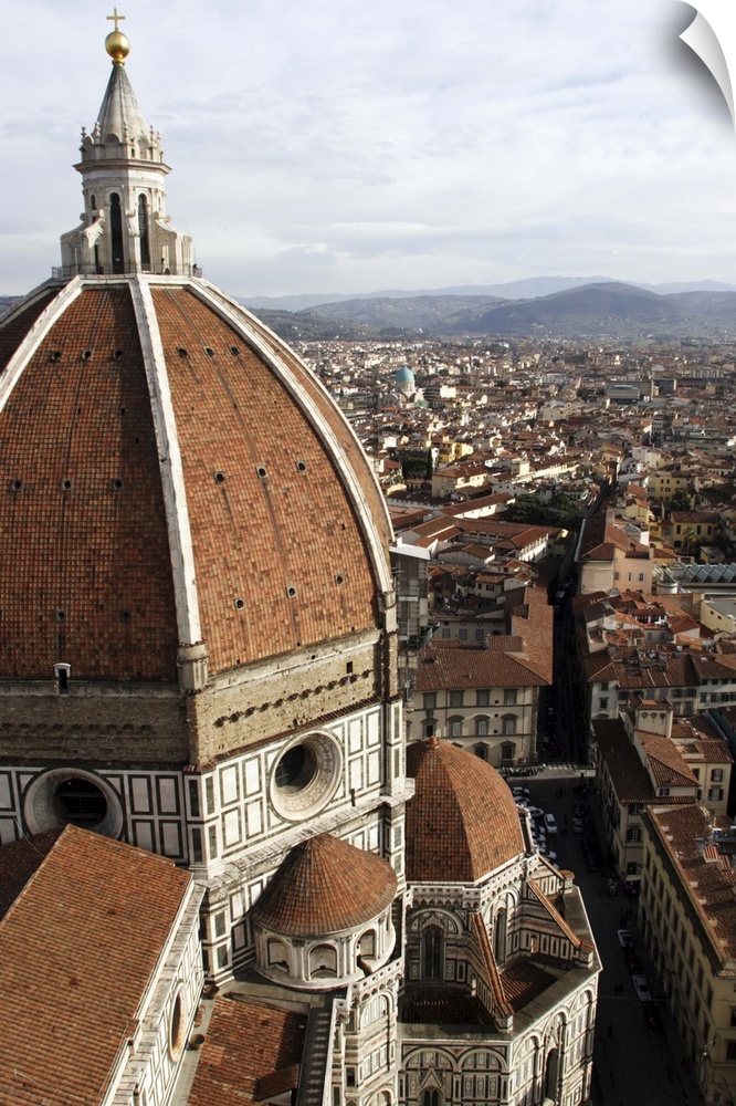 <p>The Basilica di Santa Maria del Fiore [of the Flower], also called the Dome of Florence Cathedral of Florence, Italy, is the cathedral church (Duomo) of the Roman Catholic Archdiocese of Florence, noted for its distinctive dome. Its name refers to the lily, symbol of Florence, or to the old town name Fiorenza. But a 15th century document on the other hand states that the flower refers to Christ. The cathedral complex includes the church proper, the Battistero di San Giovanni, built after Santa Croce and Santa Maria Novella. Giottoaaas bell tower (campanile) stands on the Cathedral square (Piazza del Duomo) in Florence, Italy. This bell tower is one of the showpieces of the Florentine gothic style. Standing isolated next to the Cathedral Santa Maria del Fiore and in front of the Baptistery of St. John, this splendid construction attracts the eye and the admiration of every art lover by its design, rich sculptural decorations and the many-coloured marble encrustations. This slender structure stands on a square plan with a side of 14.45 meters (47.41 ft). It attains a height of 84.7 meters (277.9 ft) sustained by four polygonal buttresses at the corners. These four vertical lines are crossed by four horizontal lines, dividing the tower in five levels. Florence (Italian: Firenze) is the capital city of the region of Tuscany, Italy. From 1865 to 1870 the city was also the capital of the Kingdom of Italy. A center of medieval European trade and finance, the city is often considered the birthplace of the Italian Renaissance and was long ruled by the Medici family. Florence is also famous for its magnificent art and architecture. It is said that, of the 1,000 most important European artists of the second millennium, 350 lived or worked in Florence. The city has also been called the Athens of the Middle Ages. The historic Centre of Florence was declared a World Heritage Site by the UNESCO in 1982. [source: Wikipedia.org]</p>