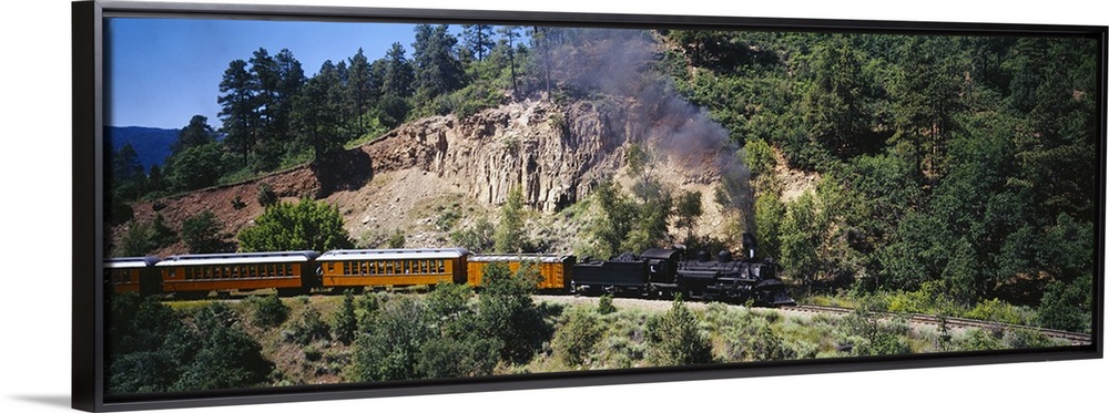 <p>This is a panoramic photograph of a vintage engine and train cars passing through the mountains on a sunny day.</p>