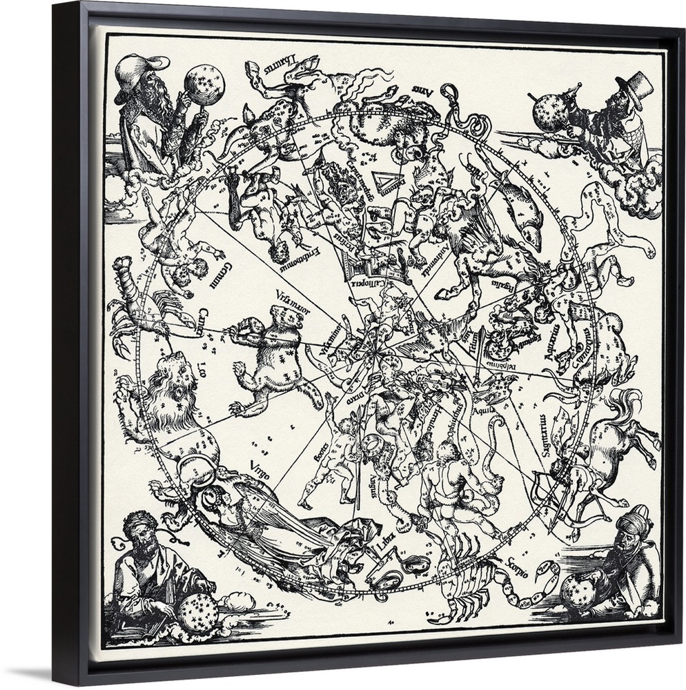 <p>Durer's Celestial Globe, 1515. This shows the northern hemisphere, and was prepared in conjunction with the astronomer Stabius. Four astronomers are shown in the corners: Aratus Cilis; Ptolomaeus Aegyptius; Maniliusromanus; and Azophi Arabus (al Sufi). Albrecht Durer (1471- 1528) produced the first printed star charts in 1515. One chart, or planisphere, showed all the northern constellations; the other depicted the southern hemisphere. The positions of the stars were exactly fixed (according to Ptolemey's catalogue) and the figures were artistically portrayed, in a classical style. Durer also chose to illustrate the constellations that would appear on a globe as if seen from space. Taken from The Complete Woodcuts of Albrecht Durer by Dr Willi Kurth (1936).</p>