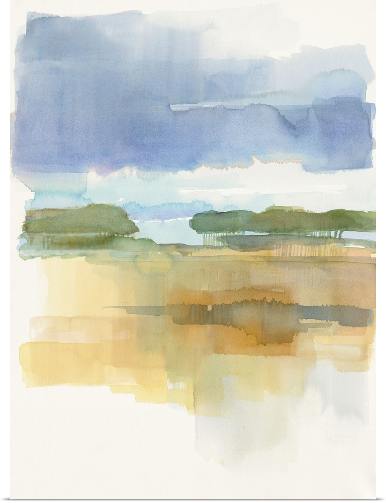 <p>Watercolor painting of a simple landscape in soft blue twilight.</p>