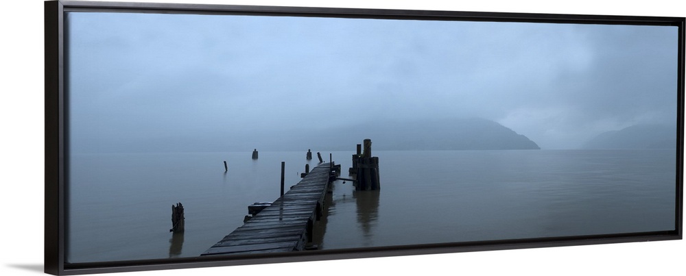 <p>A storm brews over a still lake as a rundown pier still stands in this foggy serene photograph.</p>