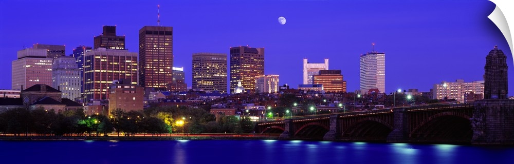 <p>Panoramic canvas of a cityscape on the waterfront with a bridge leading to it and a bright moon in the evening sky.</p>