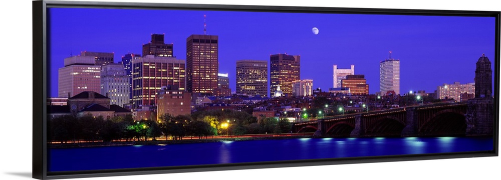 <p>Panoramic canvas of a cityscape on the waterfront with a bridge leading to it and a bright moon in the evening sky.</p>