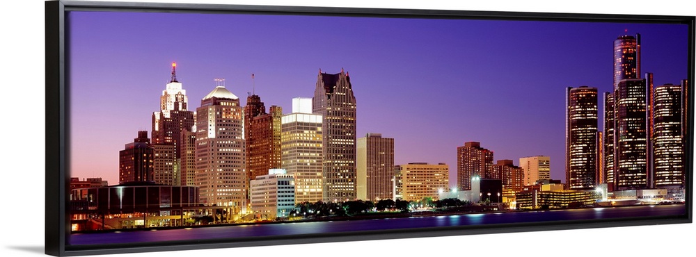 <p>A panoramic cityscape at dusk with lights illuminated the buildings and water.</p>