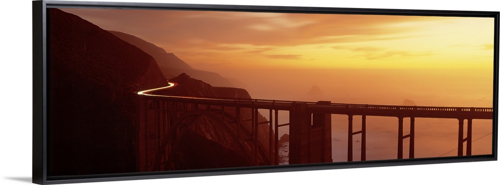 <p>Panoramic photograph of overpass winding through mountains over the ocean at sunset.</p>
