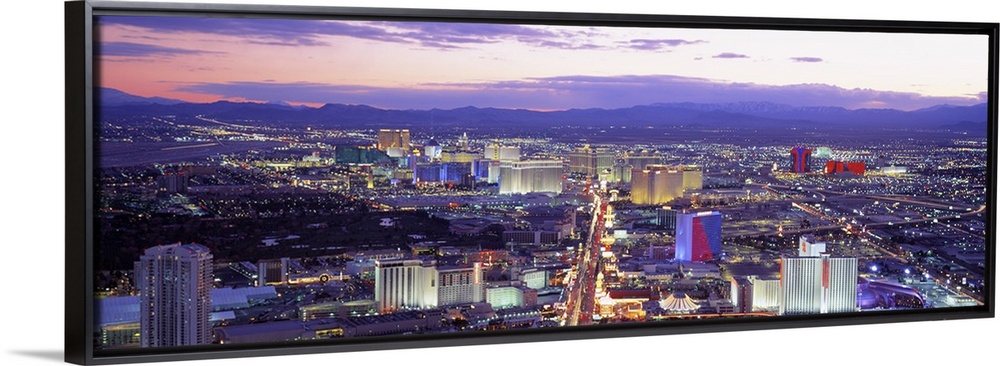 <p>Aerial shot taken over the city of Las Vegas with casinos, buildings and houses in view. All are illuminated under a sunset sky.</p>