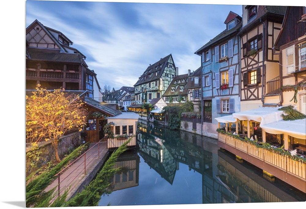 <p>Dusk lights on houses reflected in River Lauch at Christmas, Petite Venise, Colmar, Haut-Rhin department, Alsace, France, Europe</p>