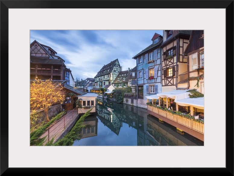 <p>Dusk lights on houses reflected in River Lauch at Christmas, Petite Venise, Colmar, Haut-Rhin department, Alsace, France, Europe</p>