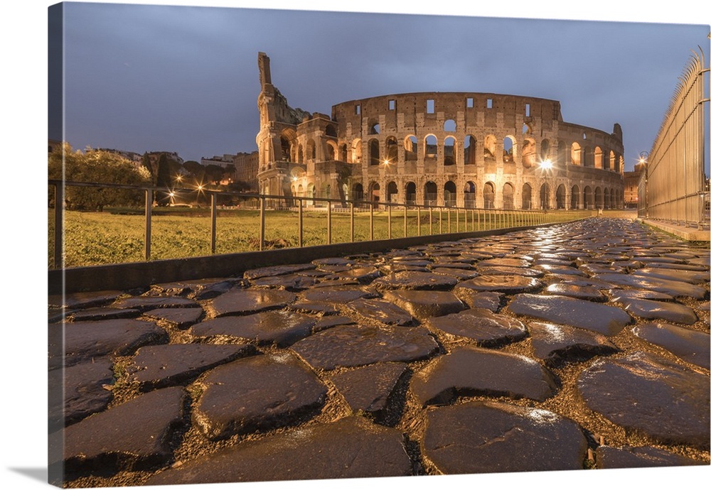 <p>Dusk lights on the Colosseum, the old Flavian Amphitheatre, and symbol of the city, Rome, Lazio, Italy</p>