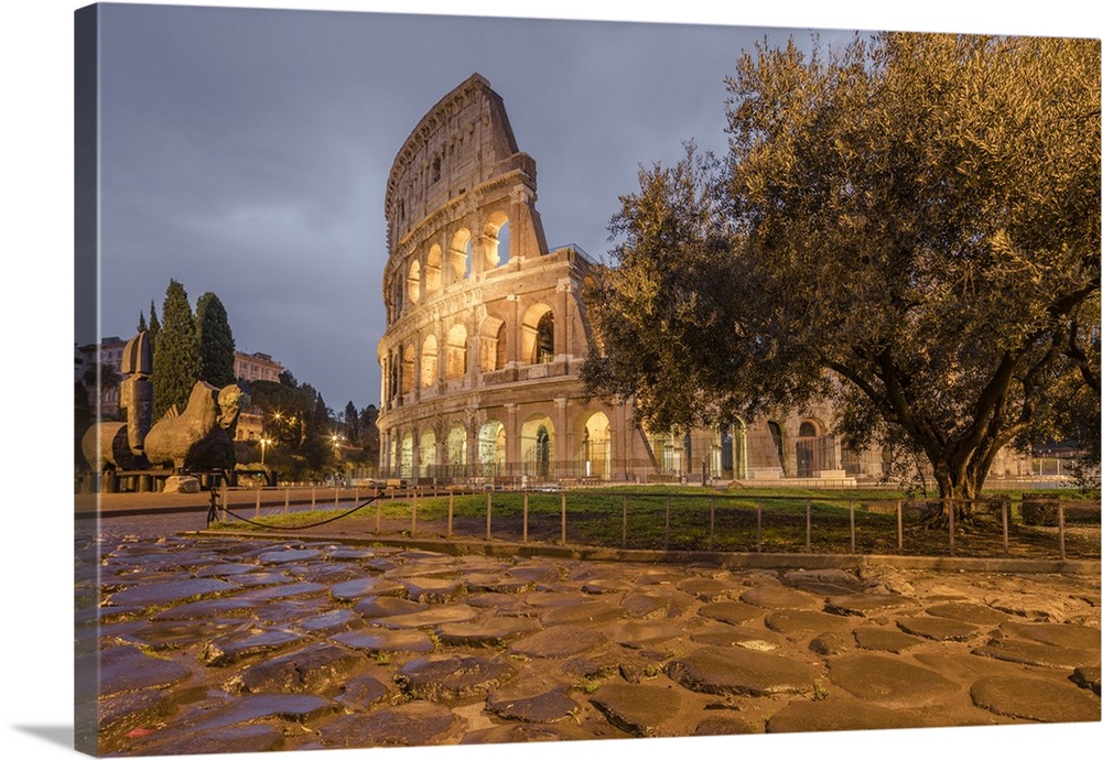 Dusk lights on the Colosseum, Rome, Lazio, Italy