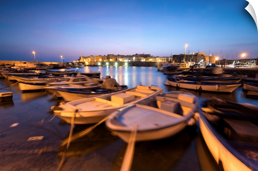 <p>Dusk lights the harbor and the medieval old town of Gallipoli, Province of Lecce, Apulia, Italy</p>