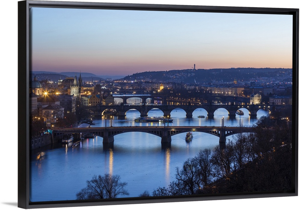 <p>Dusk lights up the historical bridges and buildings reflected on Vltava River, Prague, Czech Republic</p>
