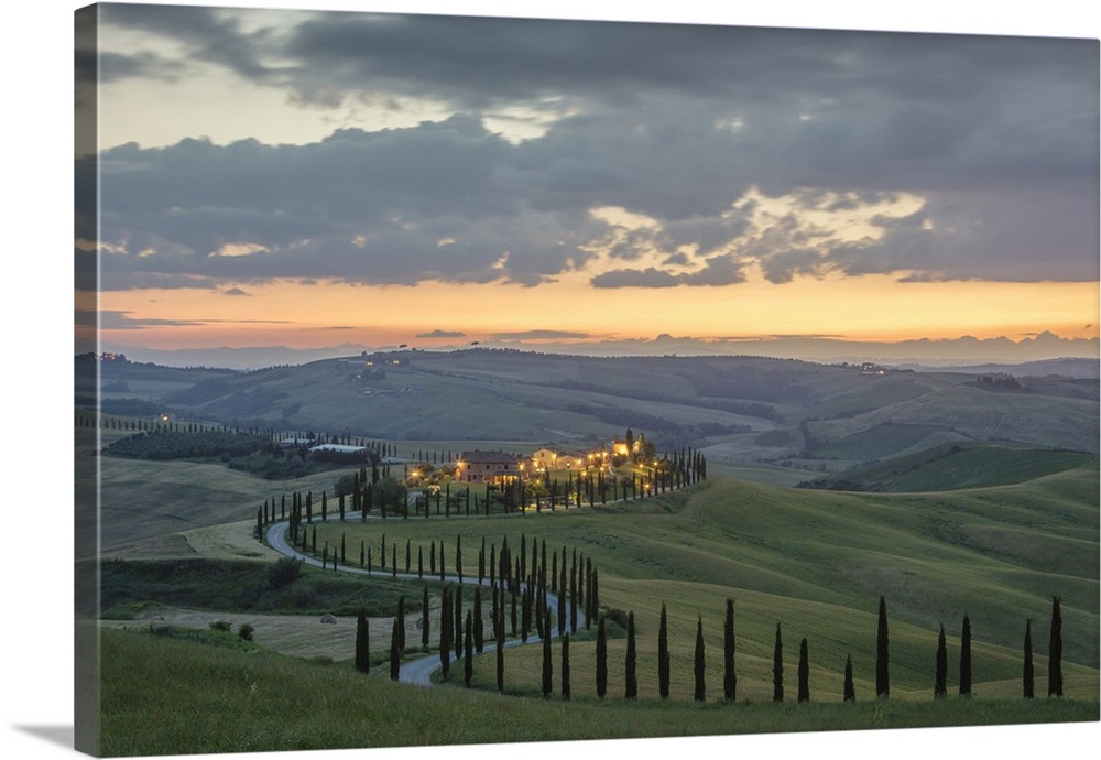 <p>Dusk on green hills surrounded by cypresses and farm houses, Crete Senesi, province of Siena, Tuscany, Italy</p>