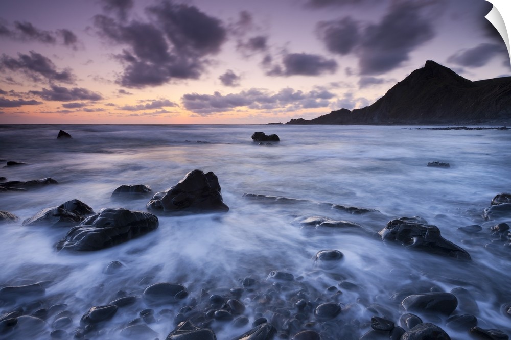 <p>Dusk on the rocky shores of Speke's Mill Mouth in North Devon, England. Summer</p>