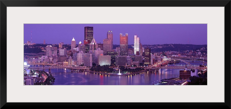 <p>Big, wide angle photograph of Pittsburgh taken at night.</p>