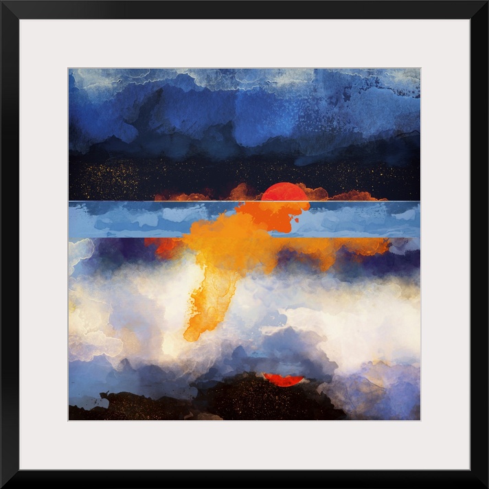 <p>Abstract depiction of a reflection at dusk with water, blue, orange and white.</p>
