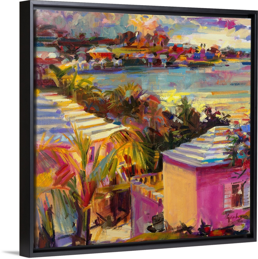 <p>Big, square painting of beach homes surrounded by palm trees, along the coastline in Bermuda. Painted with thick, harsh brushstrokes, with minimal small detail.</p>