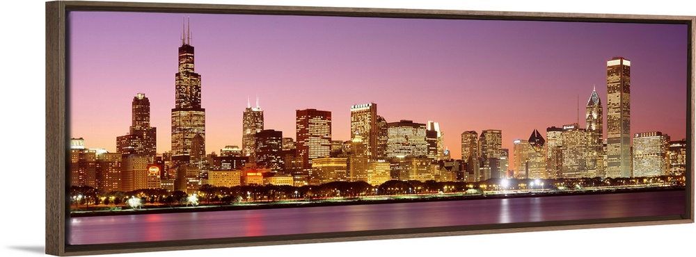 <p>A panoramic photograph of a skyscraper filled skyline taken at dusk in Chicago, Illinois. The bright lights coming off the buildings can be seen in the reflection of the water.</p>