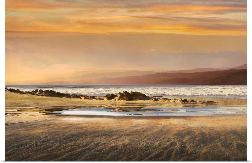 <p>Landscape photograph of a warm toned sunset over a beach at low tide.</p>