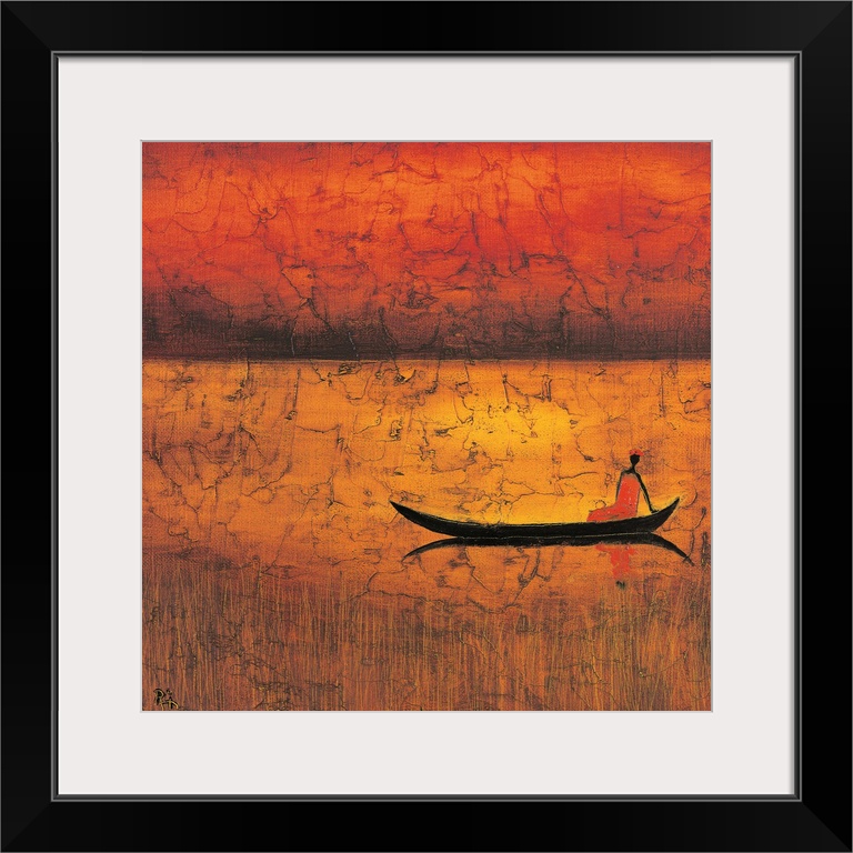 <p>Contemporary painting of a tribal figure on a boat casting a reflection in the water.</p>