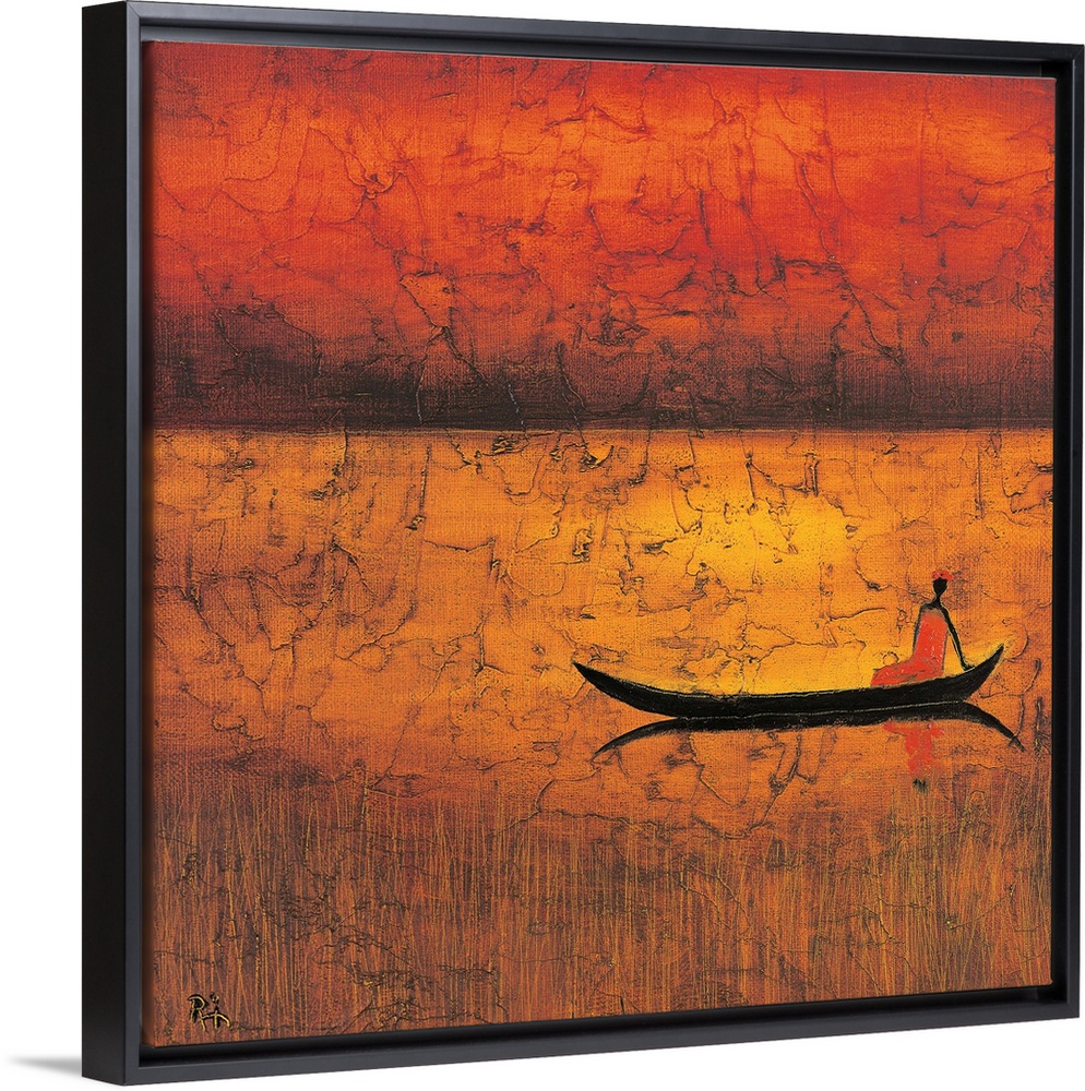 <p>Contemporary painting of a tribal figure on a boat casting a reflection in the water.</p>